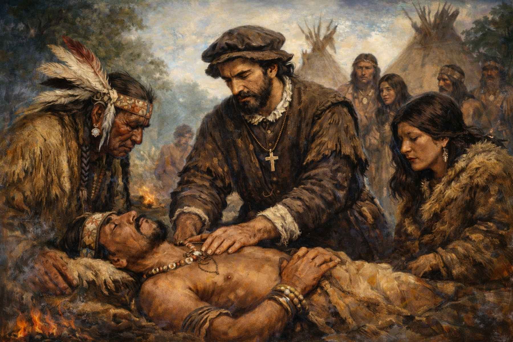 În vara anului 1535, undeva în vestul îndepărtat al Texasului sau prin nordul Mexicului, Cabeza de Vaca a efectuat prima operație chirurgicală documentată din America de Nord. Un bărbat nativ fusese rănit de o săgeată care-i intrase în spate și ajunsese aproape de inimă. „Vârful săgeții se fixase deasupra inimii, cauzând durere mare și suferință”, scria Cabeza de Vaca. A deschis pieptul bărbatului cu un cuțit, a extras obiectul intrus și a cusut apoi cu sfoară. A doua zi, a îndepărtat sutura. Bărbatul era vindecat.