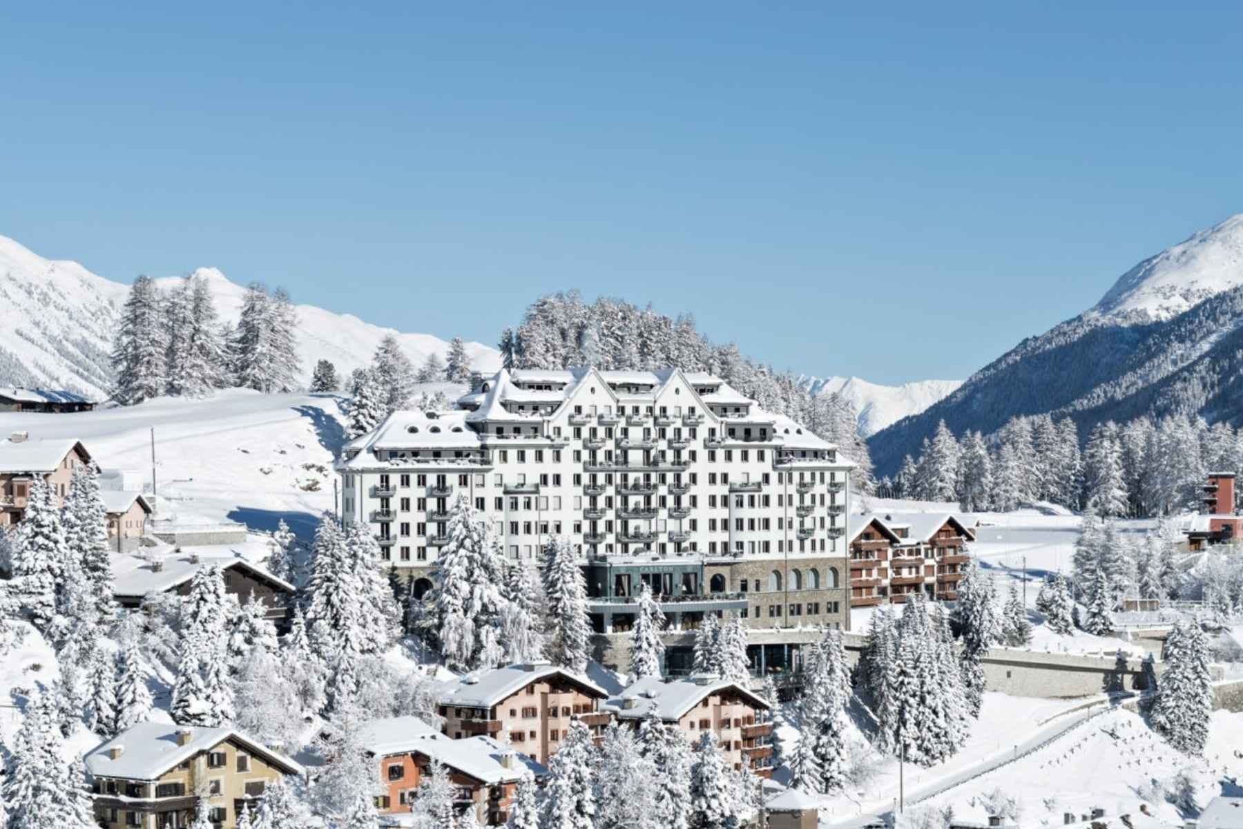 În iarna 2025–2026, Carlton Hotel St. Moritz joacă rolul refugiului perfect deasupra lacului, cu priveliști largi spre munți și Valea Engadin, într-o clădire a cărei istorie începe în 1913 și aer de „grand hotel” al Alpilor.